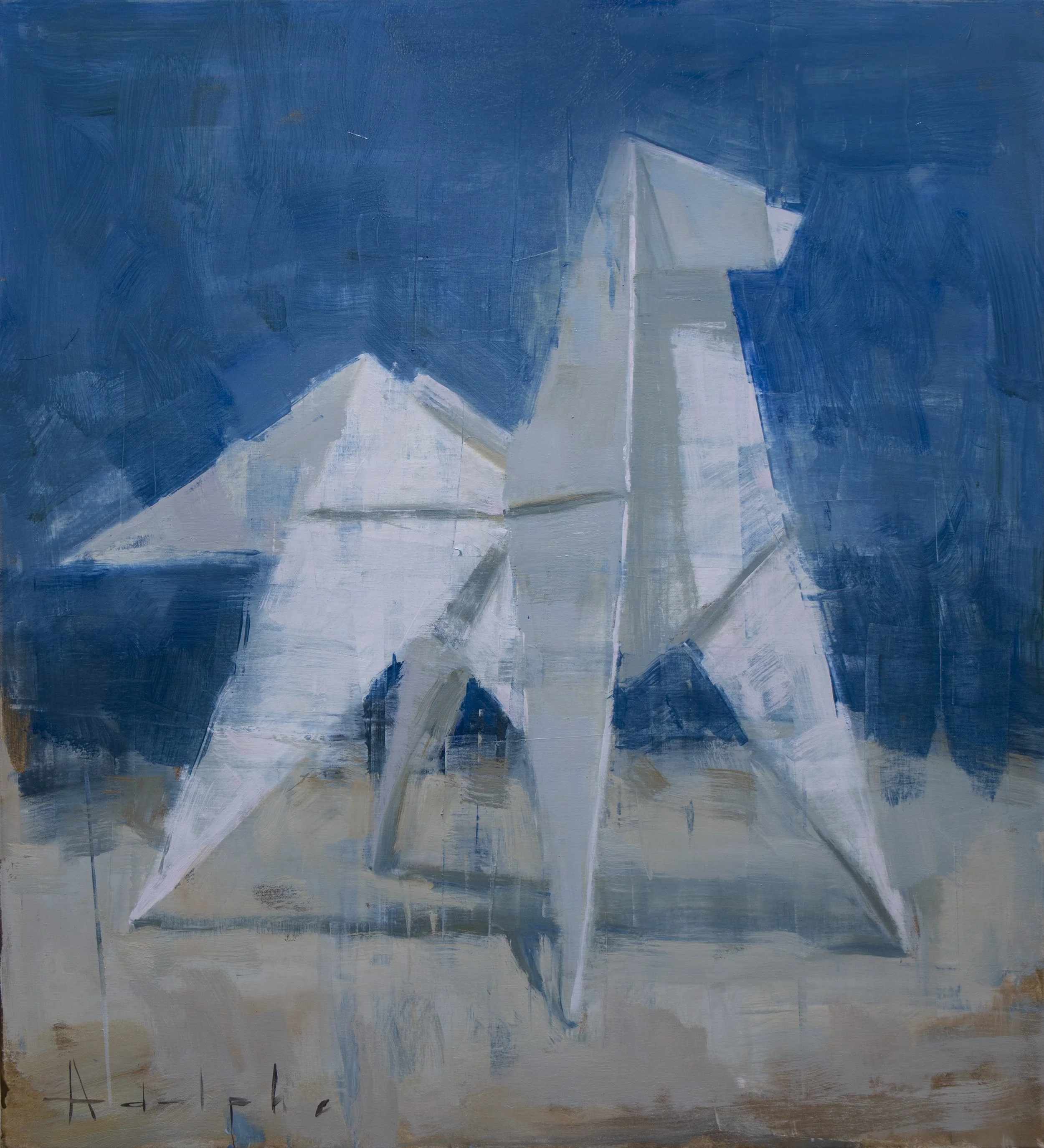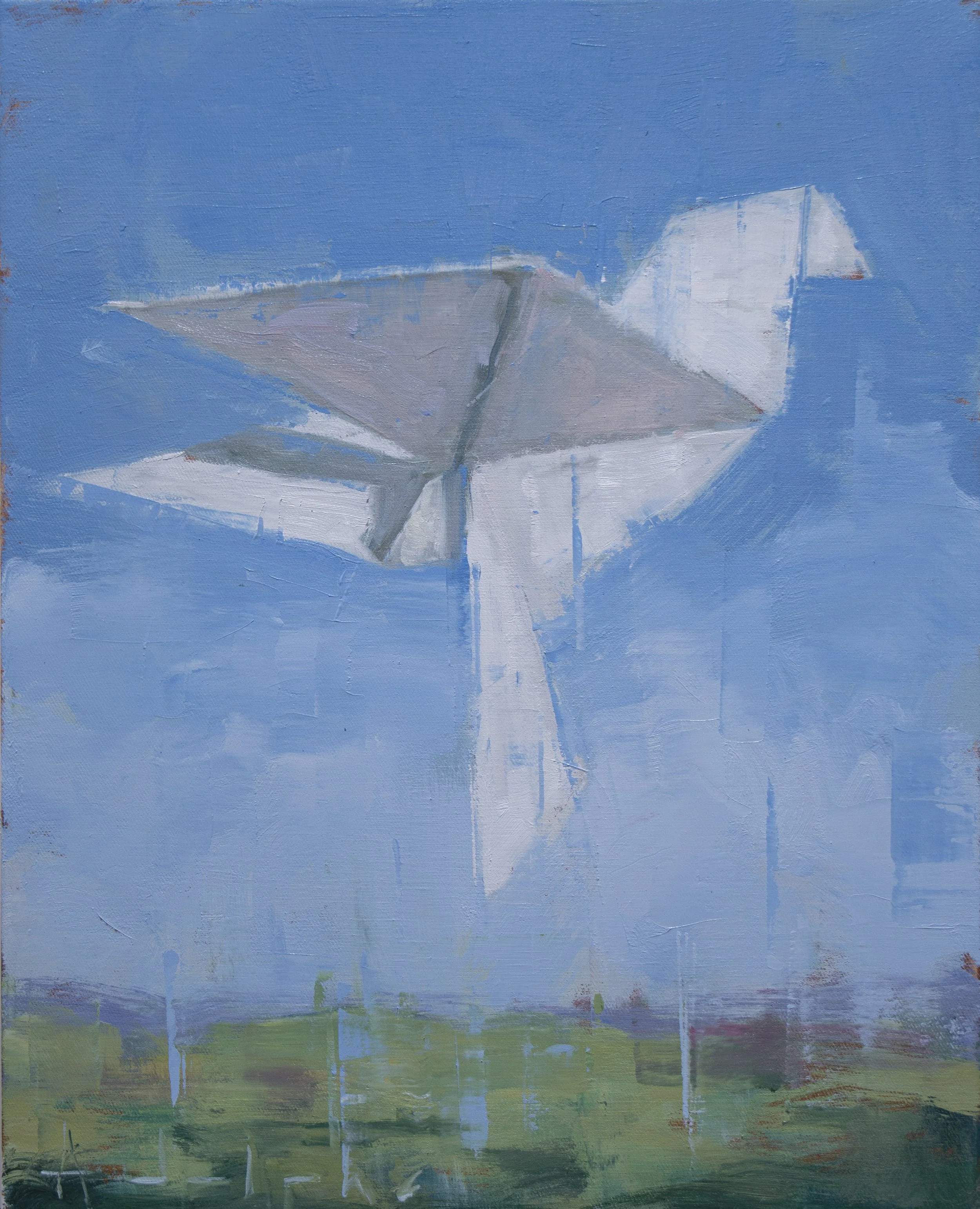 A few years ago, a young woman very close to me was stricken with a severe mental health crisis. Broken bones I can deal with, a broken mind is a form of injury that elicits the most painful forms of helplessness. During this period, I noticed the appearance of these very small origami pieces. Small horses, birds, cranes and dragons began popping up around our house. It became apparent that these small paper sculptures where a part of a long healing process. I can’t say that this sprang from a conscious decision, but I knew that one of the best ways for me to participate in this healing and rebuilding was to make paintings of these little origami works. Although all the work within “A floating world” series reflects my attempt to make sense of the issues at hand, the paintings involving the birds come closest to expressing the true anguish, frustration and hopes of all of us involved. Sometimes the bird is alone, sometimes with another bird, sometimes with three birds, sometimes birds are in a storm. In the end what emerged was a visual record of the journey from crises and despair to hope and healing—never in a straight path, but always forward.